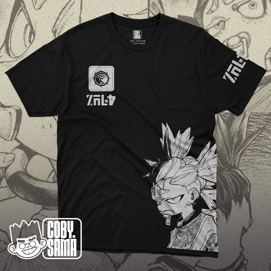 Camiseta negra de algodón 100% con diseño exclusivo inspirado en el manga Gachiakuta. El protagonista del estampado es Dear Santa, representado en un estilo monocromo detallado que resalta su fuerza y presencia. La ilustración se ubica en el lateral inferior derecho, aportando un aire dinámico y distintivo.