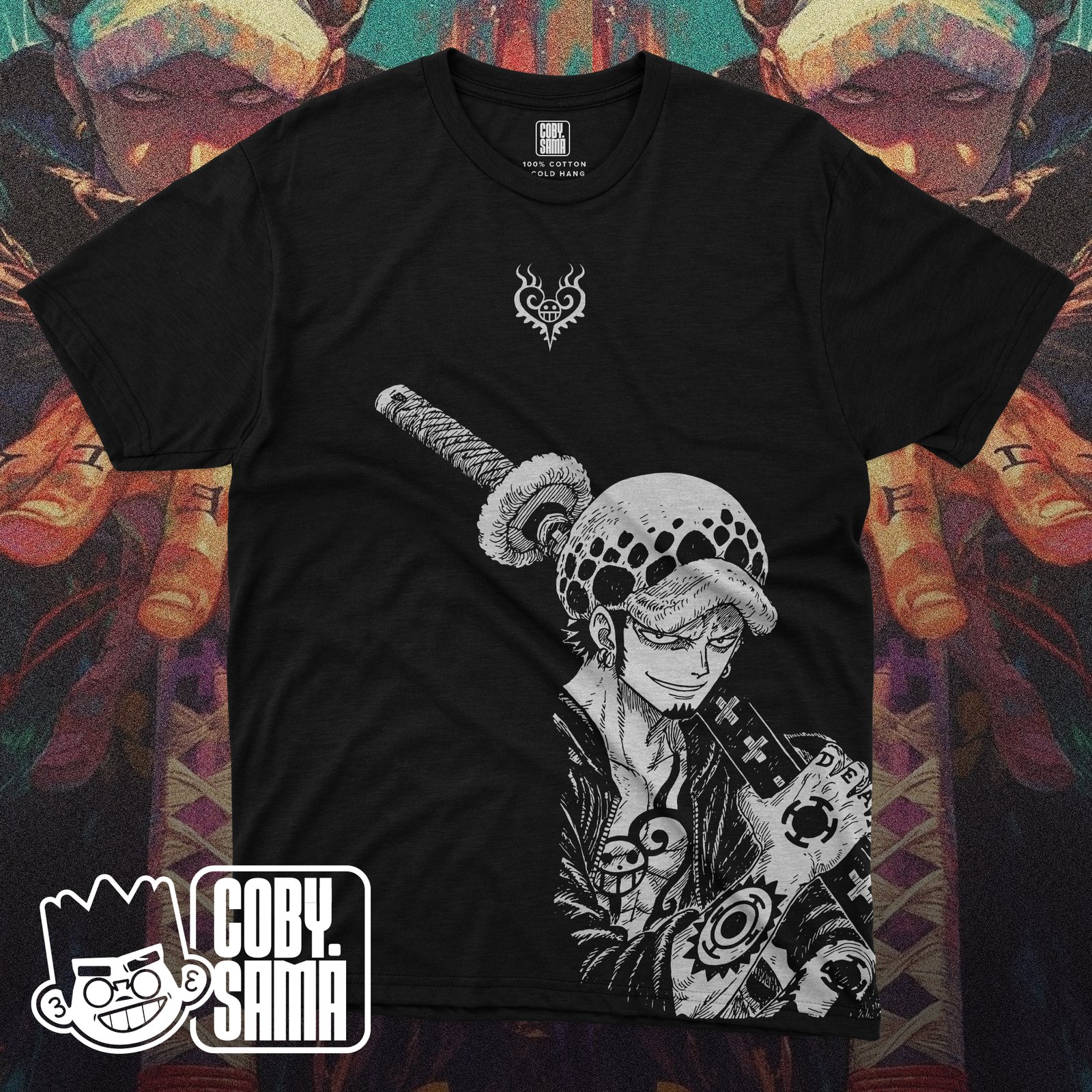 Camiseta negra de algodón 100% con diseño exclusivo inspirado en One Piece. El estampado central presenta a Trafalgar D. Water Law con su espada Kikoku, acompañado de su característico sombrero y tatuajes. Sobre la ilustración se destaca el símbolo de los Heart Pirates, reforzando su identidad como capitán. El diseño monocromo en el frente se complementa con un fondo estilizado y colorido que intensifica la atmósfera dramática del personaje. El logo Coby Sama en la parte inferior garantiza autenticidad y calidad. Una pieza imprescindible para coleccionistas y amantes del anime que buscan estilo, fuerza y narrativa en su vestuario.